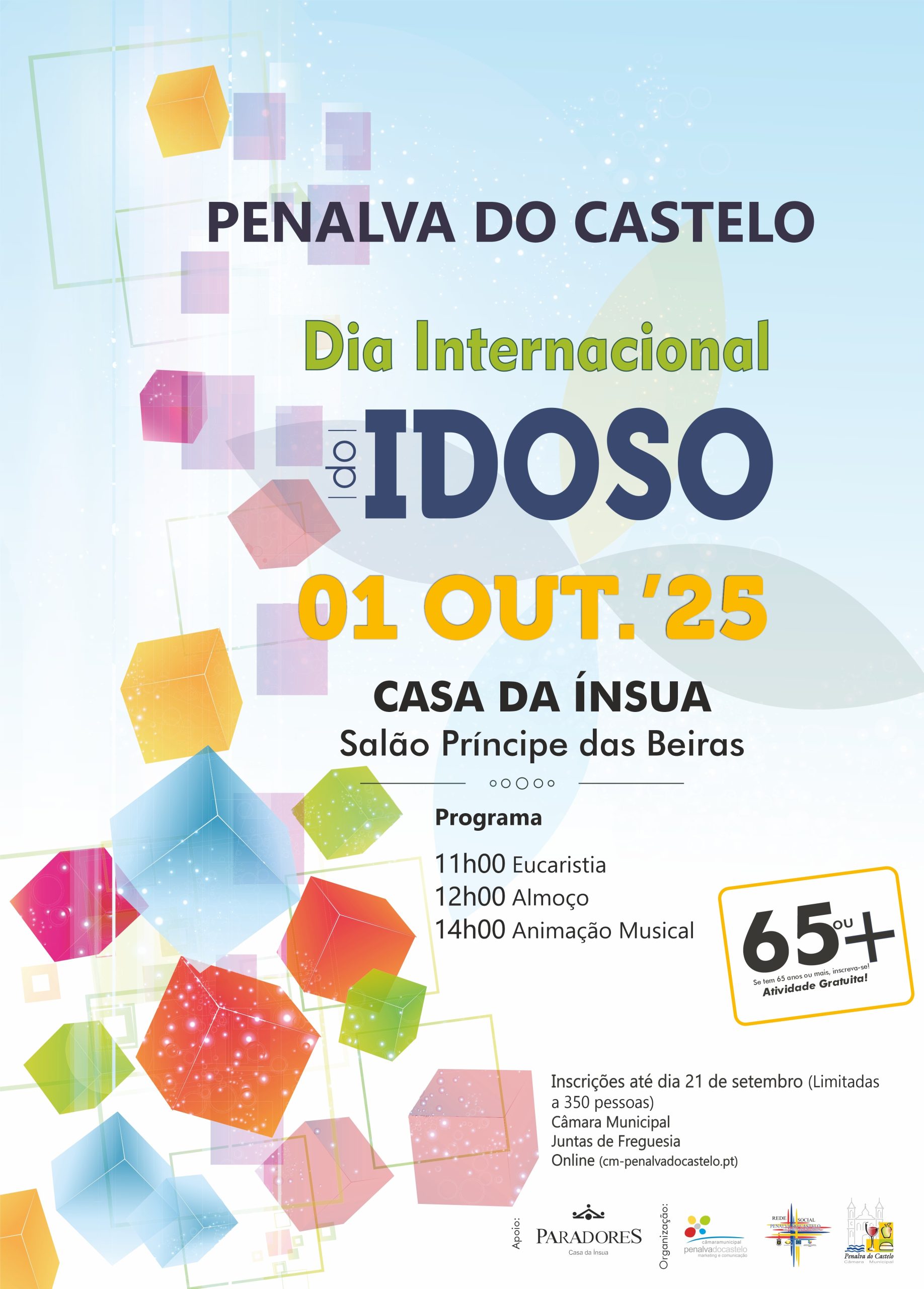 Dia Internacional do Idoso’25 01 de outubro | 11h00m Casa da Ínsua | Salão Príncipe das Beiras – Penalva do Castelo Inscrições até dia 21 de setembro (Limitadas a 350 pessoas): Câmara Municipal, Juntas de Freguesia Online Data Outubro 05 2025 Expired! Horário 11:00 am - 6:00 pm Categoria AGENDA Partilhar